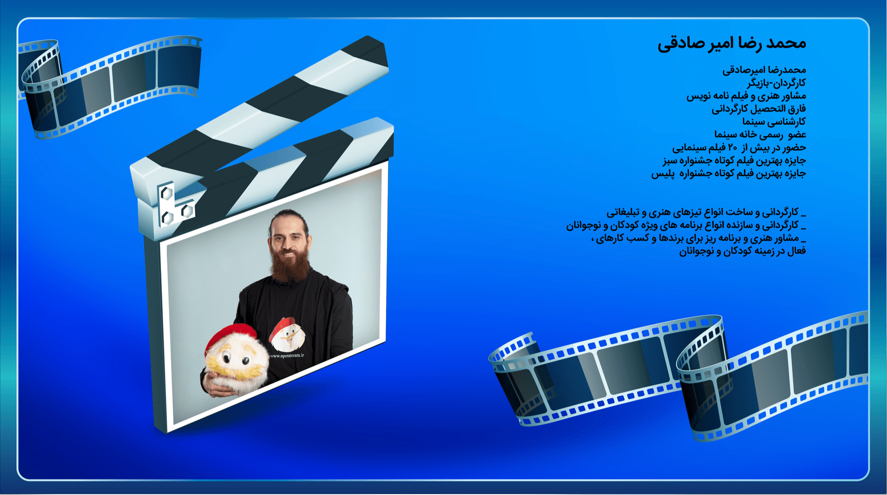 - برخی از ساختهای سینمایی و تلویزیونی این شرکت مانند پسر تهرانی، بله برون،قرمز،کلید ازدواج وحدود ۶۰ فیلم دیگر به تهیه کنندگی و سرمایه گزاری خسرو و محمدرضاامیرصادقی میباشد و همچنین رضوان سنجابی سازنده و خالق عروسکهای نمایشی این مجموعه بیش از ششصد عروسک نمایشی برای انواع مختلف برنامه هایی نمایشی خلق کرده و جزو چند عروسک ساز برتر ایران میباشد و شاگرد اساتیدی مانند بنفشه بدیعی و علی اعتصامی فر میباشد که از نوابغ عروسک سازی ایران میباشند